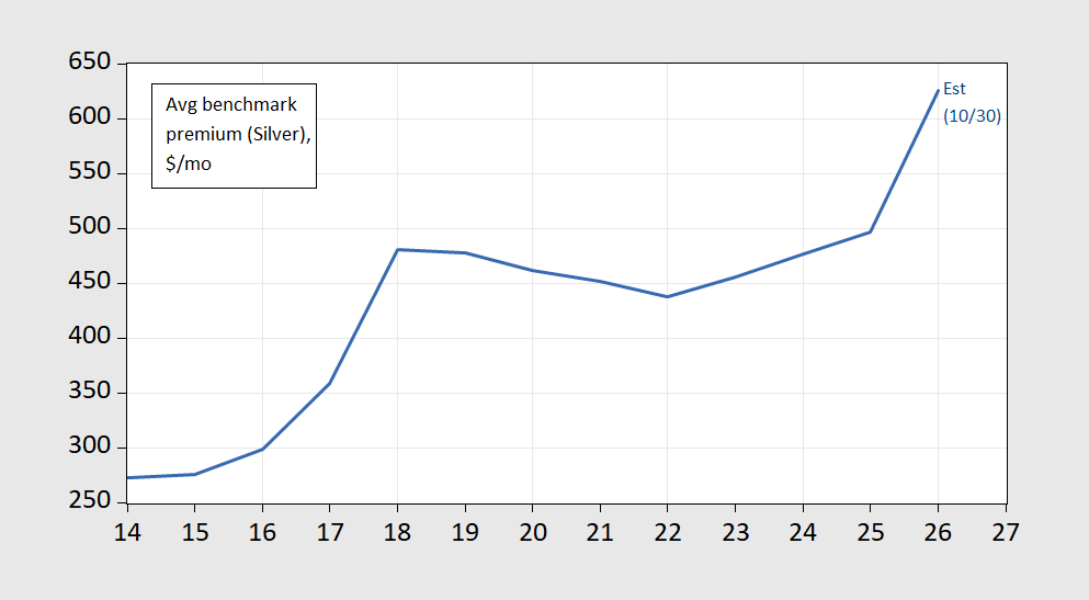 Figure 1: Average benchmark ACA premium (Silver plan, 40yr old), $/mo (blue). Note there is wide dispersion in plan premia given different states, demographics, income. Source: KFF, accessed 10/30/2025.