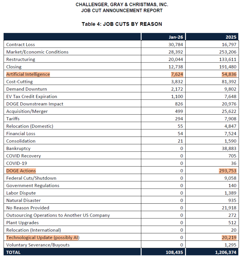In the Challenger, Gray and Christmas report for January is an interesting table, reporting the job losses attributed to each factor.