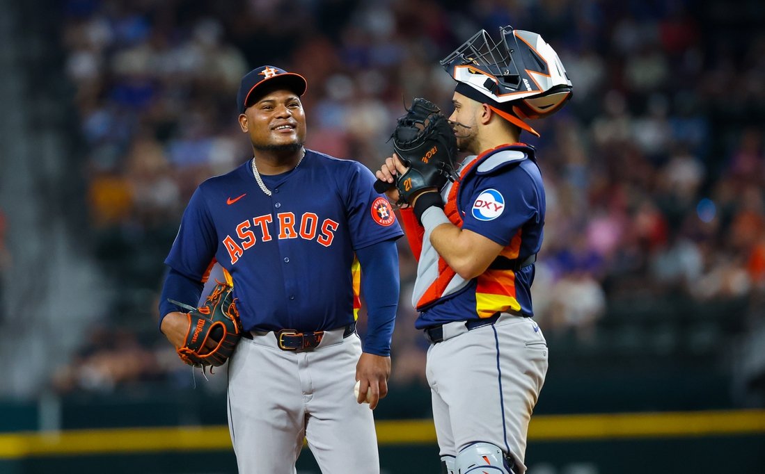 Aug 6, 2024; Arlington, Texas, USA; Houston Astros starting pitcher Framber Valdez (59) laughs with Houston Astros catcher Yainer Diaz (21) during the eighth inning against the Texas Rangers at Globe Life Field. Mandatory Credit: Kevin Jairaj-USA TODAY Sports Left-hander Framber Valdez, who was one out away from tossing his second career no-hitter in his latest start, will be back on the mound when the Houston Astros open a three-game series with the Tampa Bay Rays on Monday night in St. Petersburg, Fla.