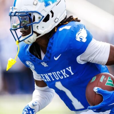 Sep 21, 2024; Lexington, Kentucky, USA; Kentucky Wildcats defensive back Maxwell Hairston (1) intercepts an Ohio Bobcats pass and carries it towards the end zone