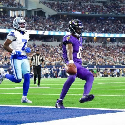 Sep 22, 2024; Arlington, Texas, USA; Baltimore Ravens quarterback Lamar Jackson (8) runs past Dallas Cowboys cornerback Trevon Diggs (7) and scores a touchdown during