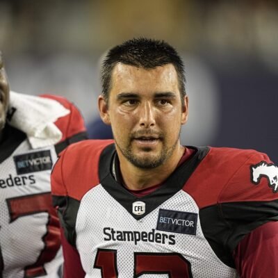 Aug 20, 2022; Toronto, Ontario, CAN; Calgary Stampeders quarterback Jake Maier (12) comes off the field after defeating the Toronto Argonauts at BMO Field. Mandatory