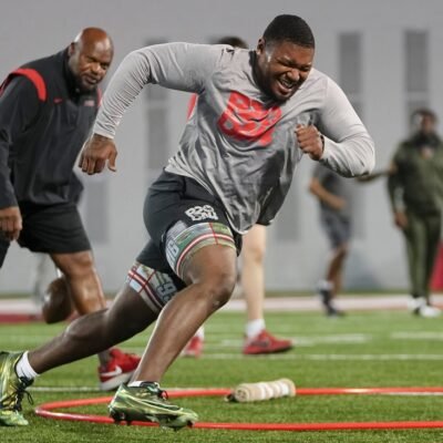 Mar 20, 2024; Columbus, Ohio, USA; Ohio State Buckeyes defensive tackle Michael Hall Jr. runs a circle drill during Pro Day at the Woody Hayes