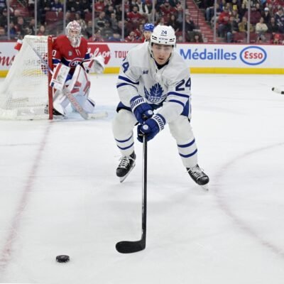 Apr 6, 2024; Montreal, Quebec, CAN; Toronto Maple Leafs forward Connor Dewar (24) plays the puck next to Montreal Canadiens goalie Cayden Primeau (30) during