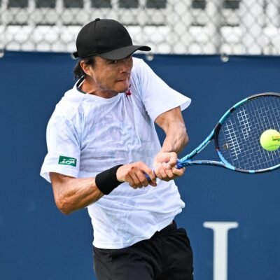 Aug 4, 2024; Montreal, Quebec, Canada; Taro Daniel (JPN) returns the ball against Aleksandar Kovacevic (USA) (not pictured) in first round qualifying play at IGA