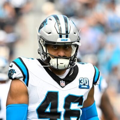 Sep 15, 2024; Charlotte, North Carolina, USA; Carolina Panthers linebacker Eku Leota (46) before the game at Bank of America Stadium. Mandatory Credit: Bob Donnan-Imagn