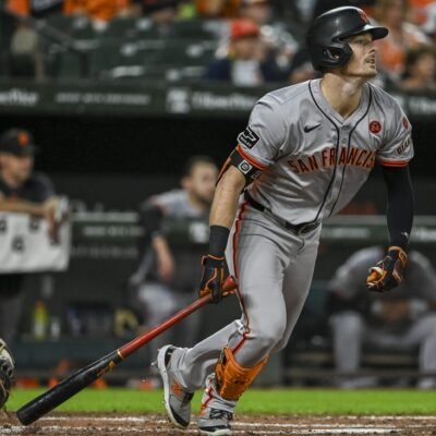 Sep 17, 2024; Baltimore, Maryland, USA; San Francisco Giants outfielder Mike Yastrzemski (5) swings throws a second inning rbi single against the Baltimore Orioles at