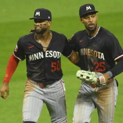 Sep 17, 2024; Cleveland, Ohio, USA; Minnesota Twins left fielder Willi Castro (50) and center fielder Byron Buxton (25) celebrate a win over the Cleveland