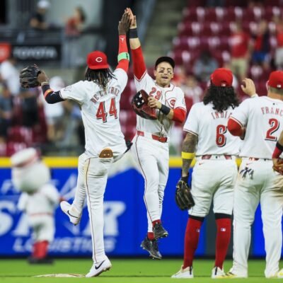 Sep 17, 2024; Cincinnati, Ohio, USA; Cincinnati Reds outfielder TJ Friedl (29) high fives shortstop Elly De La Cruz (44) after the victory over the
