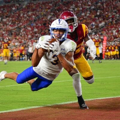 Aug 26, 2023; Los Angeles, California, USA; San Jose State Spartans wide receiver Nick Nash (3) catches a touchdown pass in front of Southern California