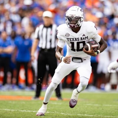 Sep 14, 2024; Gainesville, Florida, USA; Texas A&M Aggies quarterback Marcel Reed (10) runs with the ball against the Florida Gators during the first half
