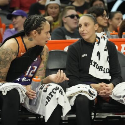 Phoenix Mercury center Brittney Griner (42) and guard Diana Taurasi talk during the second quarter against the Las Vegas Aces at Footprint Center on Sept.