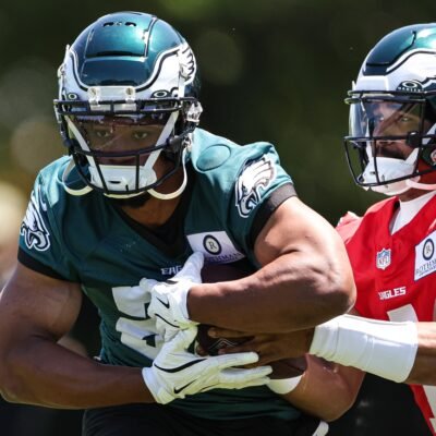 May 30, 2024; Philadelphia, PA, USA; Philadelphia Eagles quarterback Jalen Hurts (1) hands off to running back Saquon Barkley (26) during practice at NovaCare Complex.