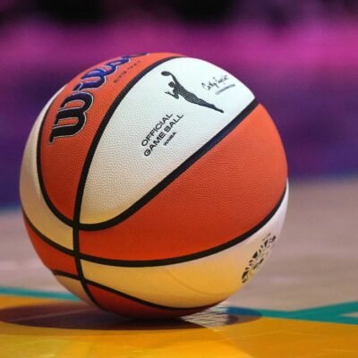 Jul 9, 2024; Los Angeles, California, USA; Detailed view of Wilson official WNBA Evo NXT basketball at Crypto.com Arena. Mandatory Credit: Kirby Lee-Imagn Images Nneka