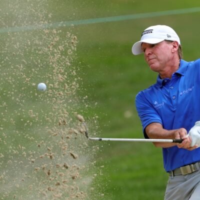 Steve Stricker plays his second shot from a bunker on the seventh hole during the third round of the Kaulig Companies Championship at Firestone Country
