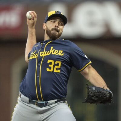Sep 10, 2024; San Francisco, California, USA; Milwaukee Brewers pitcher Aaron Civale (32) pitches during the first inning against the San Francisco Giants at Oracle