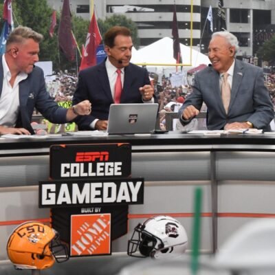 Pat McAfee Nick Saban, and Lee Corso fist bump before live broadcast during ESPN Gameday near Williams-Brice Stadium in Columbia, S.C.Saturday, September 14, 2024. DirecTV