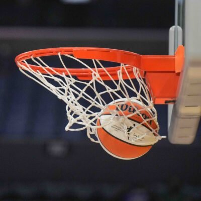Jul 7, 2024; Los Angeles, California, USA; A Wilson official WNBA Evo NXT basketball approaches the net and rim at the Crypto.com Arena. Mandatory Credit: