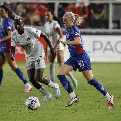 Sep 13, 2024; Cary, North Carolina, USA; North Carolina Courage midfielder Denise O’Sullivan (10) dribbles the ball against Bay FC forward Racheal Kundananji (9) during