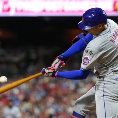 Sep 13, 2024; Philadelphia, Pennsylvania, USA; New York Mets outfielder Brandon Nimmo (9) hits a three run home run during the fifth inning against the