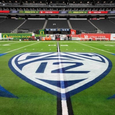 Dec 3, 2021; Las Vegas, NV, USA; A detailed view of the Pac-12 Conference logo at midfield at Allegiant Stadium before the 2021 Pac-12 Championship