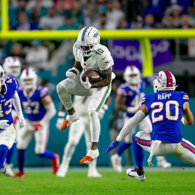 Miami Dolphins wide receiver Tyreek Hill (10), leaps to make a catch for a first down in front of Buffalo Bills safety Taylor Rapp (20),