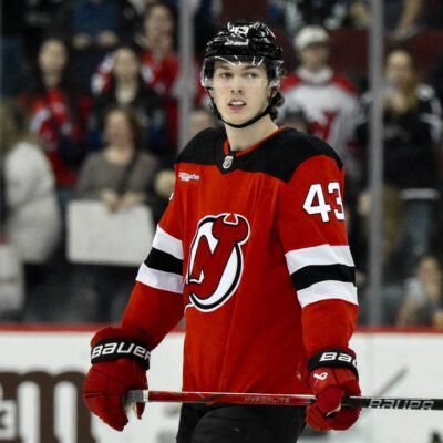 Apr 9, 2024; Newark, New Jersey, USA; New Jersey Devils defenseman Luke Hughes (43) warms up before a game against the Toronto Maple Leafs at