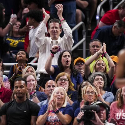 Aug 28, 2024; Indianapolis, Indiana, USA; Fans cheer for Indiana Fever guard Kelsey Mitchell (0) during a game between the Indiana Fever and the Connecticut