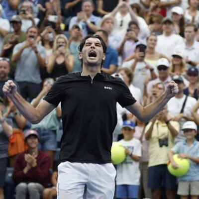Sep 1, 2024; Flushing, NY, USA; Taylor Fritz (USA) celebrates after his match against Casper Ruud (NOR)(not pictured) in a men’s singles match on day