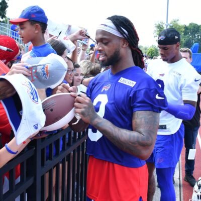 Jul 24, 2024; Rochester, NY, USA; Buffalo Bills safety Damar Hamlin (3) and wide receiver Keon Coleman (0) sign autographs for fans after a training