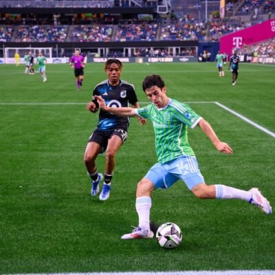 Jul 26, 2024; Seattle, Washington, USA; Seattle Sounders FC forward Paul Rothrock (14) crosses the ball while defended by Minnesota United forward Loic Mesanvi (90)
