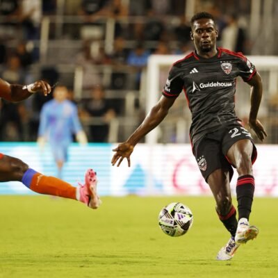 Aug 9, 2024; Washington, District of Columbia, USA; D.C. United forward Dominique Badji (23) kicks the ball against Mazatlan defender Willian Vargas (27) during the