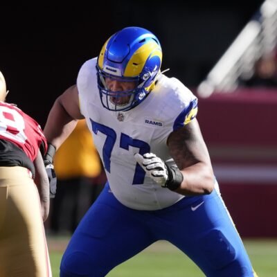 Jan 7, 2024; Santa Clara, California, USA; Los Angeles Rams offensive tackle Alaric Jackson (77) blocks San Francisco 49ers defensive tackle Javon Hargrave (98) during