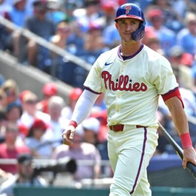 Jul 29, 2024; Philadelphia, Pennsylvania, USA; Philadelphia Phillies outfielder Austin Hays (9) against the Cleveland Guardians at Citizens Bank Park. Mandatory Credit: Eric Hartline-USA TODAY