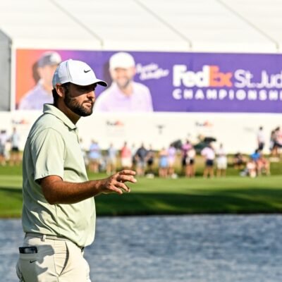 Aug 18, 2024; Memphis, Tennessee, USA; Scottie Scheffler waves to the crowd on the 18th green during the final round of the FedEx St. Jude