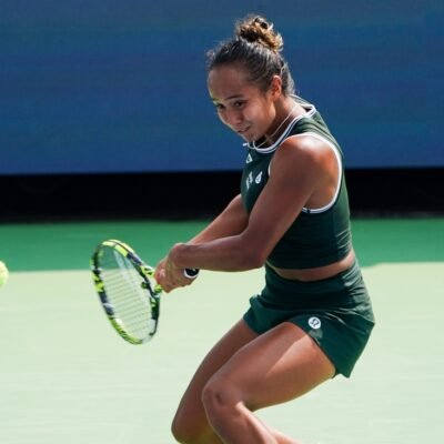 Leylah Fernandez makes a hit to Jessica Pegula in the women’s singles quarterfinals during the Cincinnati Open, Saturday, Aug. 17, 2024, at the Lindner Family