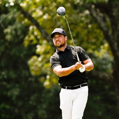 Aug 18, 2024; Memphis, Tennessee, USA; Xander Schauffele plays his shot from the seventh tee during the final round of the FedEx St. Jude Championship