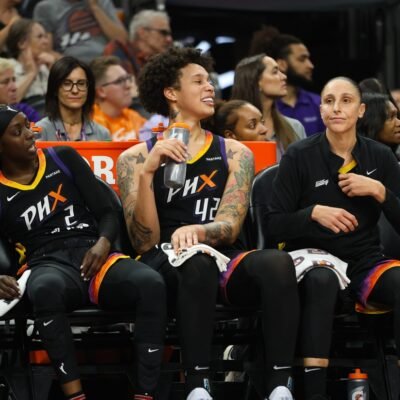 Phoenix Mercury guard Kahleah Copper (2), Phoenix Mercury center Brittney Griner (42) and Phoenix Mercury guard Diana Taurasi (3) sit son the bench during the