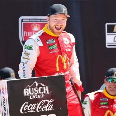 Aug 19, 2024; Brooklyn, Michigan, USA; NASCAR Cup Series driver Tyler Reddick (45) reacts after winning the Fire Keepers 400 at Michigan International Speedway. Mandatory