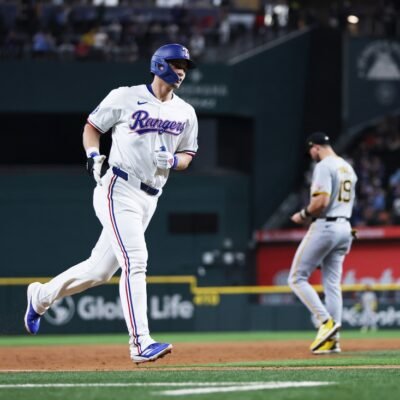Aug 19, 2024; Arlington, Texas, USA; Texas Rangers shortstop Corey Seager (5) rounds the bases after hitting a three-run home run against the Pittsburgh Pirates