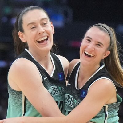 Aug 15, 2024; Los Angeles, California, USA; New York Liberty forward Breanna Stewart (30) and guard Sabrina Ionescu (20) celebrate in the first half against