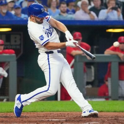 Aug 19, 2024; Kansas City, Missouri, USA; Kansas City Royals third baseman Paul DeJong (15) hits a two-run home run against the Los Angeles Angels