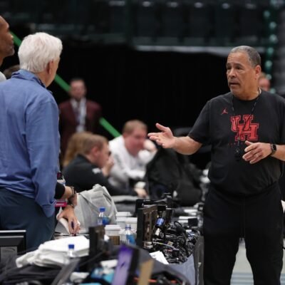 Mar 28, 2024; Dallas, TX, USA; Houston Cougars head coach Kelvin Sampson (R) talks to TV commentators Grant Hill (L) and Bill Raftery (C) during