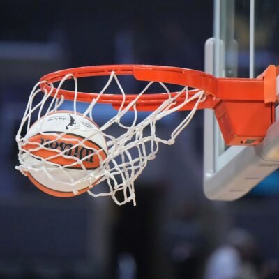 May 25, 2023; Los Angeles, California, USA; Wilson official basketball with WNBA logo goes through the net during the game between the LA Sparks and