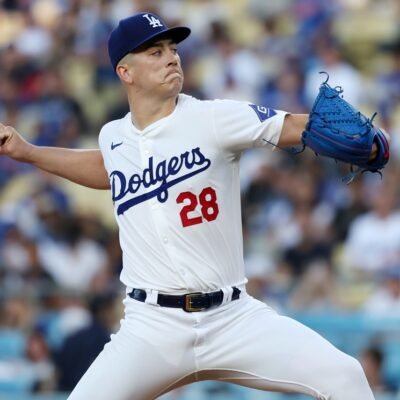 Jul 2, 2024; Los Angeles, California, USA; Los Angeles Dodgers starting pitcher Bobby Miller (28) pitches during the first inning against the Arizona Diamondbacks at