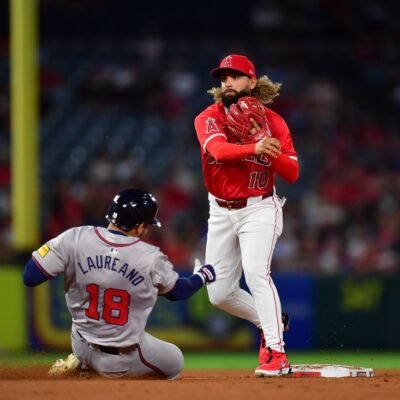 August 16, 2024; Anaheim, California, USA; Atlanta Braves right fielder Ramon Laureano (18) is out at second as Los Angeles Angels second baseman Jack Lopez