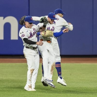 Aug 14, 2024; New York City, New York, USA; New York Mets outfielders Harrison Bader (44), Ben Gamel (21) and Brandon Nimmo (9) celebrate after