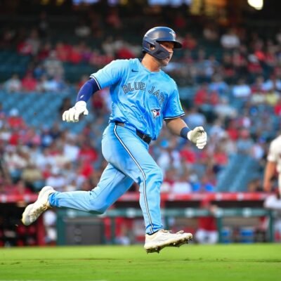 Aug 13, 2024; Anaheim, California, USA; Toronto Blue Jays second baseman Will Wagner (7) runs after hitting a double against the Los Angeles Angels during
