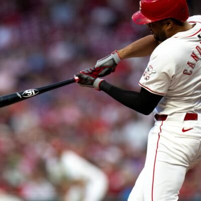 Cincinnati Reds first baseman Jeimer Candelario (3) hits a 2-run home run in the sixth inning of the MLB game between the Cincinnati Reds and