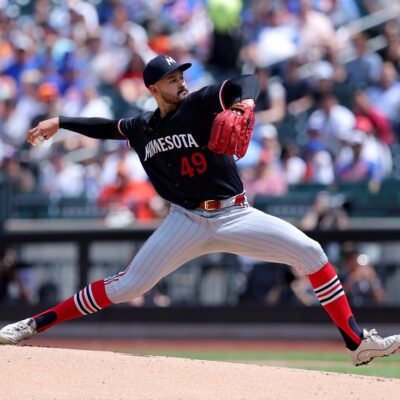 Jul 31, 2024; New York City, New York, USA; Minnesota Twins starting pitcher Pablo Lopez (49) pitches against the New York Mets during the first
